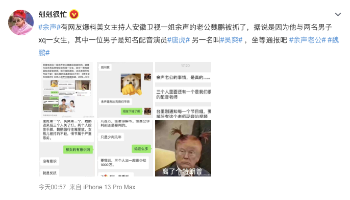 近日,主持圈再爆丑闻。安徽卫视知名主持人余声的丈夫魏鹏疑似被抓,同时爆料了大量聊天记录。