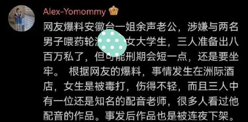 至于原因,网上也传了几天了,据说是余声的丈夫魏鹏和其他两名男子一起侵犯了一名女大学生,其中一名男子是知名配音演员、主持人唐虎。