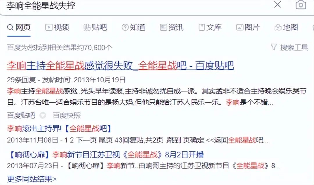 2013年一档歌手真人秀《全能星战》交给李响主持,结果网上骂声一片,控场能力和幽默水平都遭到了网友的质疑,所以在这之后交给李响的节目都比较正式了。