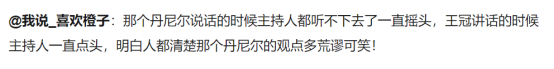 整场辩论进行了十多分钟,王冠据理力争、思维缜密,让美国专家毫无招架之力,只能胡搅蛮缠地发表一些毫无佐证且充满了西方感情色彩的观点,典型的恼羞成怒引起的思维混乱。就连主持人听了都无奈摇头。