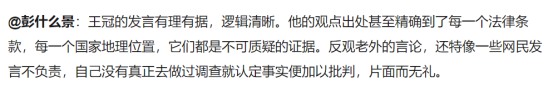 他指出“中国影响航行自由”是伪命题。节目播出后,引起中外舆论热议,网友纷纷称赞王冠“霸气”“睿智”,真正发出了中国声音,抗衡了西方媒体观点,是用英文向世界解释中国的青年榜样。