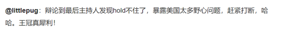不少网友认为这段采访“有思想有逻辑,分分钟打脸美国”,外媒女主播也当场表示王冠的观点很有意思,在西方媒体中很是鲜见。