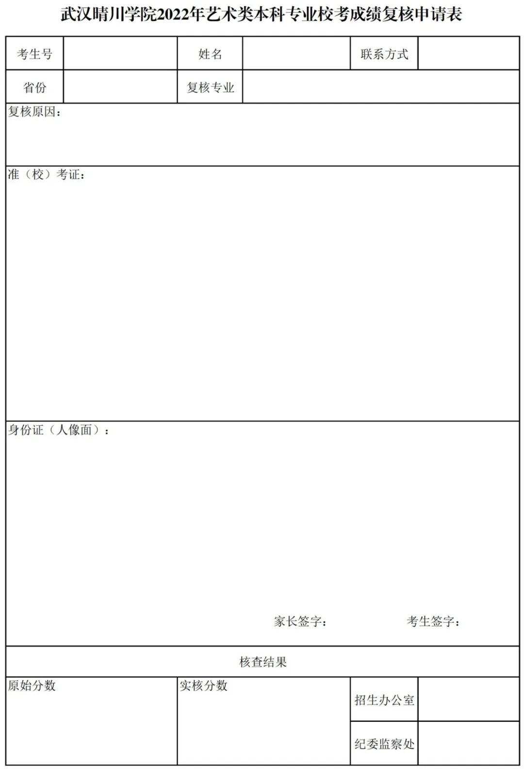 2、请考生在申请复核时间内下载并打印《武汉晴川学院2022年艺术类专业校考成 绩复核申请表》,按照表格要求填写,签字后扫描或拍照(请保持画面清晰)发送 到qcxyzs@sina.cn 邮箱(电子邮件名称格式统一为:考生姓名+身份证号,不接受 现场复查手续办理)。