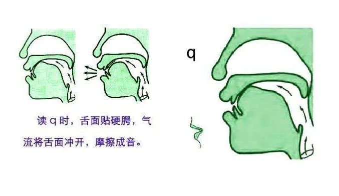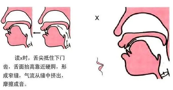 在发j时,舌面前部抵住硬腭前部,软腭上升,气流因通路被完全封闭而积蓄起来,然后舌面前部微离硬腭,形成一个窄缝,气流从窄缝中泄出,摩擦成声,声带不振动。发q的阻碍部位和发音方式与发j同,只是在发q时,冲出的气流比发j时要强许多。在发x时,舌面前部靠近硬腭前部,形成一个窄缝,软腭上升,气流从舌面与硬腭间的窄缝里挤出,摩擦成声,声带不振动。