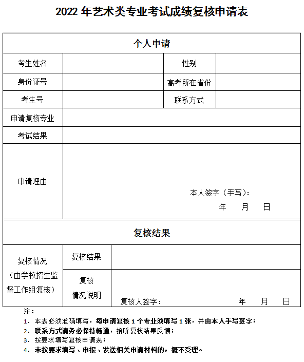 2.申请方式:申请复核的考生请下载2022年艺术类专业考试成绩复核申请表