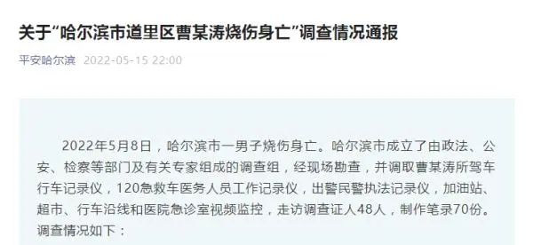 针对沸沸扬扬的曹某涛烧伤身亡事件,哈尔滨警方再次发布通报。通报回应了此前舆论关切。对于整个通报,有网友如此总结:“汽油是自己买的,火是自己点的,妈妈教他说谎诬陷,妹妹拍视频网暴。”尽管这种总结过于简单化,但基本梳理了事实。