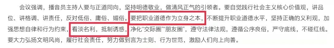 今年4月19日,国家广电总局召开的播音员主持人工作座谈会上也强调,播音员主持人要与正道同向,坚持明德敬业,做清风正气的引领者。要自觉践行社会主义核心价值观,讲品位、讲格调、讲责任,反对低俗、庸俗、媚俗。要把职业道德作为立身之本,不断提升职业道德水平,坚持正确的义利观,加强思想自律和行为约束,看淡名利,抵制诱惑,净化“交际圈”“朋友圈”,遵守法律法规,遵循公序良俗,严守底线,不碰红线。要大力弘扬文明风尚,履行社会责任,努力做到言为士则、行为世范,激励人们向上向善。
