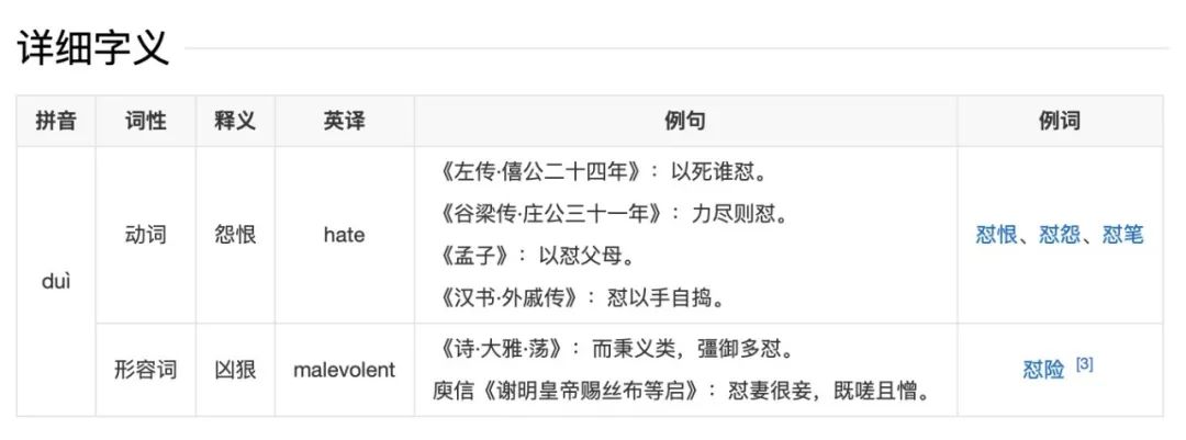 不妨再看字典对「怼」的解释,古今之义都一直是“怨恨”之意,没有发生过变化,也没有引申之义,如果不是网络带动了「怼」的热潮,如果没有给它赋予攻击、讽刺、反驳等意,那光靠「怼」的“怨恨”之义想必和当下人们的使用习惯存在一定偏差。
