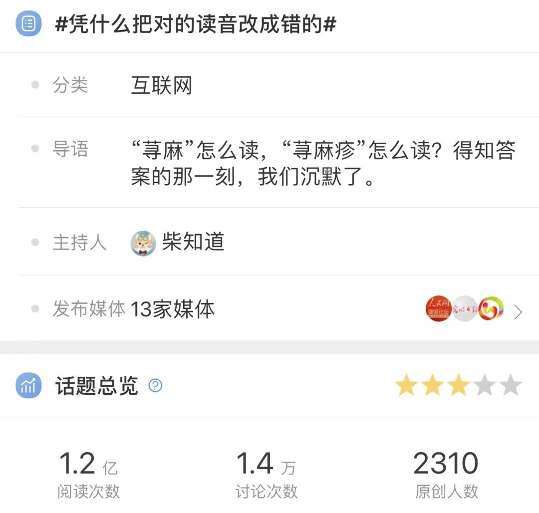 话题缘起一位博主发视频讨论“荨麻疹”怎么读,本来荨只有一个读音「qián」,由于多数人都读「xún」的缘故,便“将错就错”,在《异读词审音表》上对“荨”的注音也就为“统读「xún」”了。