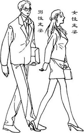 最后我们来说走姿。走姿是站姿的延续动作。无论是在日常生活中还是在社交场合,走路往往是最引人注目的身体语言,也最能表现出一个人的风度和活力。行走中,对头部、肩部、胸部、腰背部的基本要求也是与站姿、坐姿的要求基本是一致的。另外还要注意的是:双臂——以肩关节为轴摆动,双腿——膝盖正对前方,腰部——最好用腰部走路(用腰部的力量来带动腿部向前迈进),即起步时身子稍向前倾,重心落前脚掌,膝盖伸直,脚尖向正前方伸出,行走时双脚踩在一条直线上。行走时要两臂以身体为中心,自然摆动,前摆约35度,后摆约15度,手掌朝向体内。