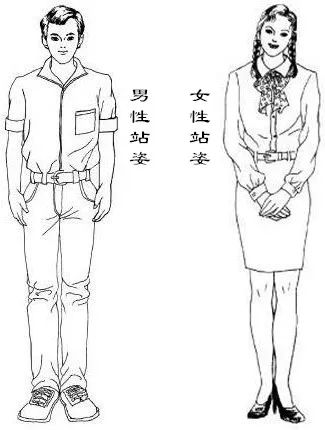 首先我们来说站姿。正确的站姿应该是身体的各个部位是放松的,不是僵直的,但放松并不意味着松懈,而是积极的放松状态。那什么是积极的放松状态呢?头部--自然摆正,眼睛—平视前方,肩部——自然下垂,胸部——放松舒展,腰部—挺直,腹部——有绷紧的感觉,双脚——男可稍微分开一点与肩同宽,女可一前一后,成丁字形站立。