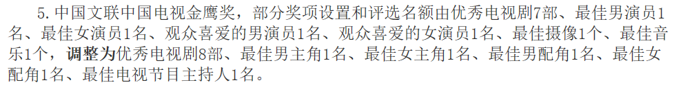 据人社部公示显示,中国文联中国电视金鹰奖,部分奖项设置和评选名额由优秀电视剧7部、最佳男演员1名、最佳女演员1名、观众喜爱的男演员1名、观众喜爱的女演员1名、最佳摄像1个、最佳音乐1个,调整为优秀电视剧8部、最佳男主角1名、最佳女主角1名、最佳男配角1名、最佳女配角1名、最佳电视节目主持人1名。