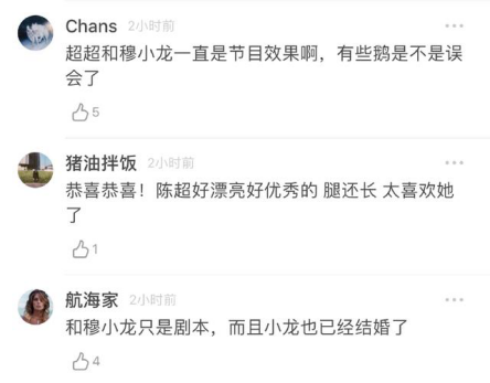 据说陈超和穆小龙在节目上暧昧只是剧本,并且很多网友还信以为真两人会走到一起,其实穆小龙早已经结婚了。
