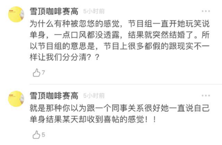 节目组经常在节目上开她的玩笑说她单身,她一点口风也没有透露,结果突然就结婚了。