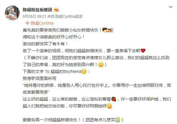 之前陈超给人的感觉就是专心于工作,根本无暇顾及婚恋之事的形象。陈超的官方微博粉丝后援团在某一天突然宣布陈超结婚了,并且在这之前没有告知任何粉丝,
