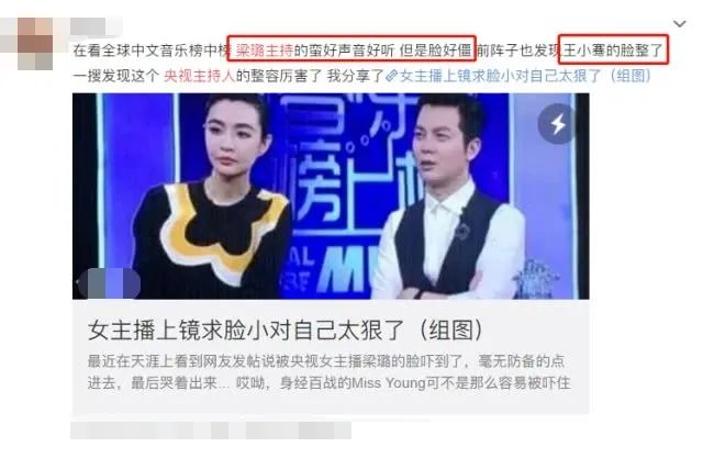 但是当她整完以后,回归荧幕时,却遭到了许多网友们的吐槽,甚至还有人说一看到她就想关电视,这样的反应大概是梁璐不曾想到的吧。整容后的她,脸部看起来十分僵硬,而且整完容后的梁璐在事业上也并没有取得什么进步,反而主持的节目是无人问津,真是让人遗憾,不知道梁璐自己有没有后悔。