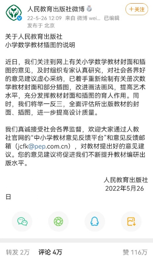 近日,我们关注到网上有关小学数学教材封面和插图的意见,及时组织专家认真研究,对社会各界好的意见建议虚心采纳,已着手重新绘制有关册次数学教材封面和部分插图,改进画法画风,提高艺术水平,充分发挥教材封面和插图的育人作用。同时,我们将举一反三,全面评估所出版教材的封面、插图,进一步提高设计质量。
