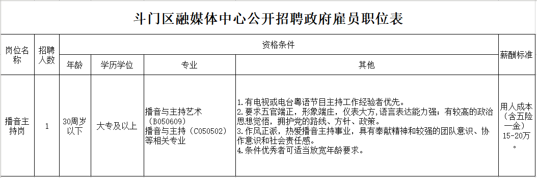 根据工作需要,珠海市斗门区融媒体中心现面向社会公开招聘政府雇员1名,公告如下: