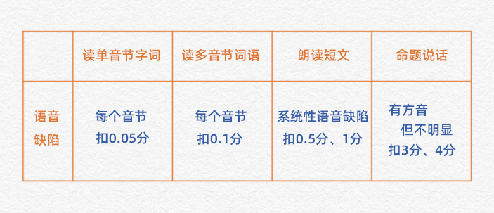 这一项有一个评分点,是新大纲新增的,就是“声母或韵母的系统性语音缺陷,视程度扣0.5分、1分”。