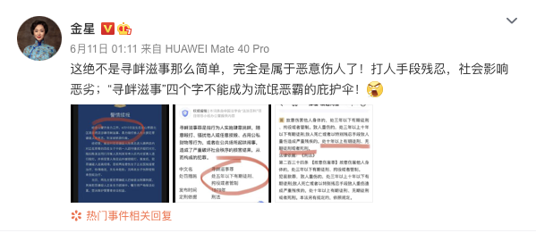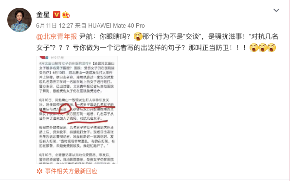 6月11日中午,金星发的一篇微博迅速窜上了热门,她在这篇微博中指名道姓的骂北青报的记者尹航,“你眼瞎吗?”网友看了也是解气的说道,”骂得好!“