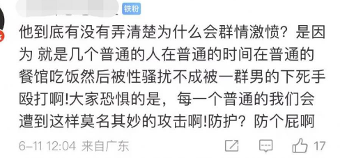 ,也不要说女孩不应该晚上去吃饭,正常经营的饭店,结伴出行的就餐,面对骚扰正当拒绝,居然还遭到如此暴力侵害,这是女孩的错吗?这是受害者平白无辜的飞来横祸、无妄之灾。