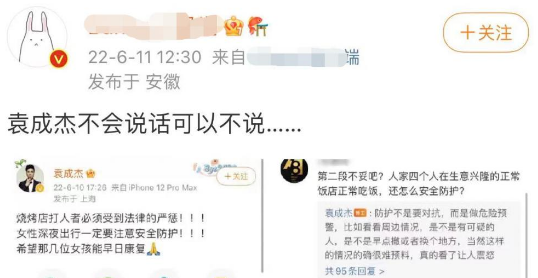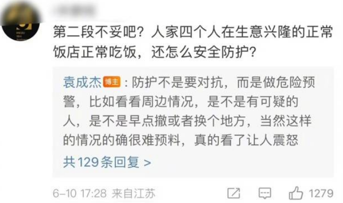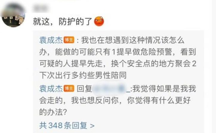 袁成杰则在评论区回复网友称换安全点的地方聚会或者出行多约男性陪同。
