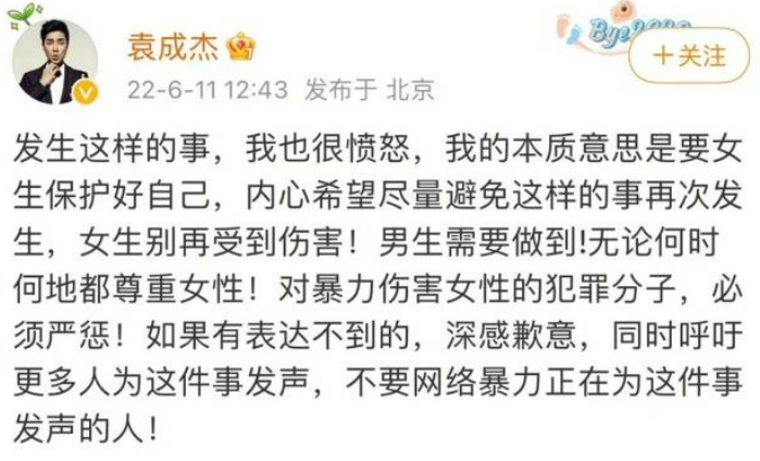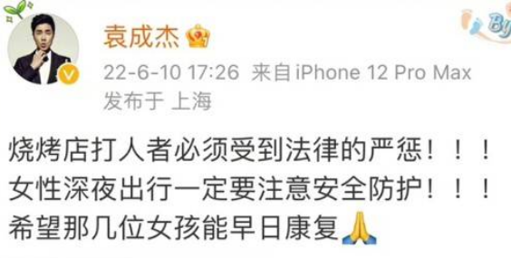 袁成杰发文表示法律要严惩打人者,同时表示女性深夜出行一定要注意