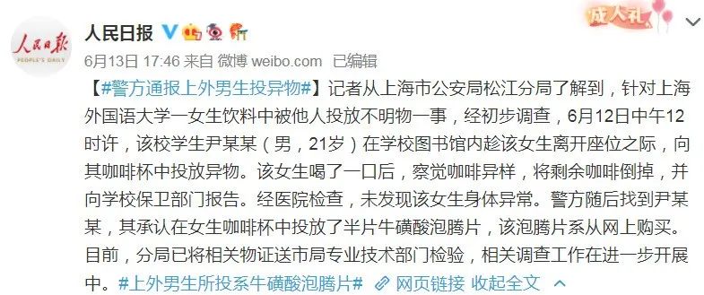 首先,警方是证实尹某某所投异物为牛磺酸,对身体没有危害,但他带给这位女生的心理伤害是极大的。