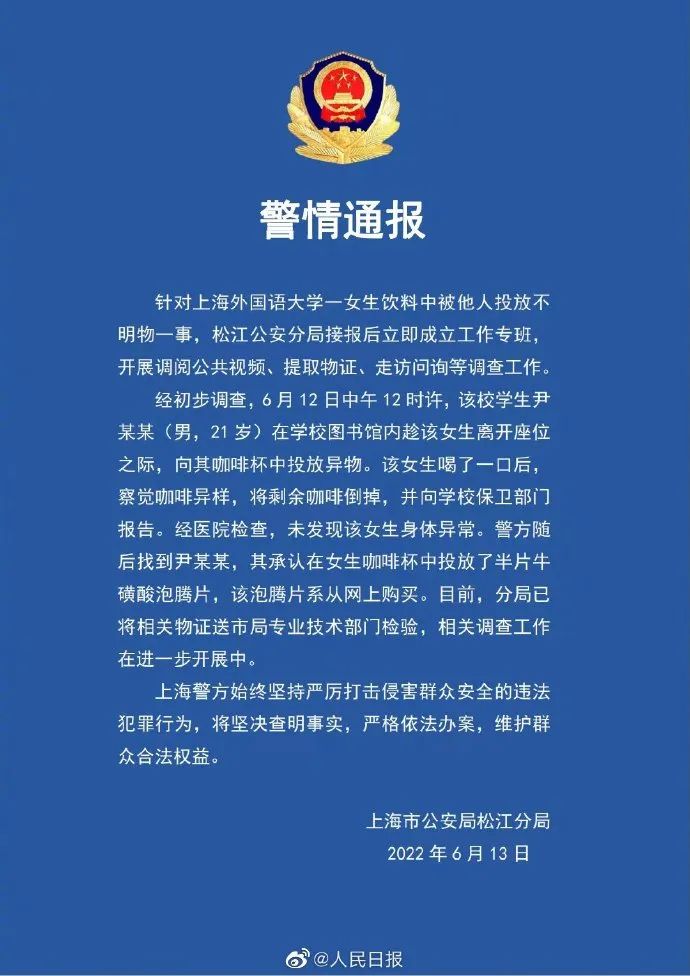 针对上海外国语大学一女生饮料中被他人投放不明物一事,松江公安分局接报后立即成立工作专班,开展调阅公共视频、提取物证、走访问询等调查工作。