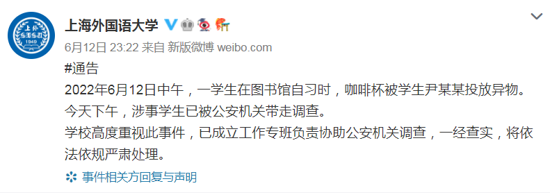 2022年6月12日中午,一学生在图书馆自习时,咖啡杯被学生尹某某投放异物。今天下午,涉事学生已被公安机关带走调查。
