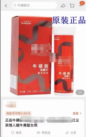 不过在网友们的帮助下,小编很快知道,牛磺酸最早由牛黄中提取而得名,是一种含硫的非蛋白氨基酸,与胱氨酸、半胱氨酸的代谢密切相关,有增强免疫力、保护视网膜、保护心肌、抗氧化等作用。但是,在某宝上,也有某类产品用以牛磺酸的名义销售。