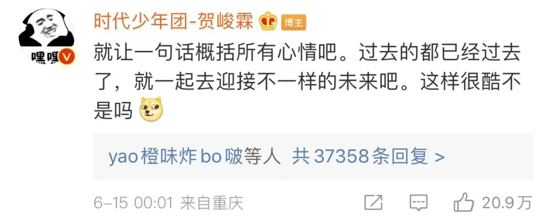“就让一句话概括所有的心情吧。过去的已经过去了,就一起去迎接不一样的未来吧。这样很酷不是吗?”这是贺峻霖在微博评论里说的一句话。其实,这个刚满18岁的成年人已不知收获多少粉丝的喜爱,吸粉的重要原因无疑是他一种在用自己的实力说话。