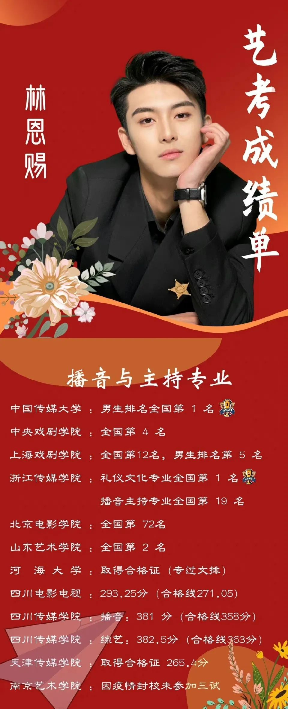 作为今年成功艺考生的他,考取了中国传媒大学男生排名全国第一,浙江传媒学院播音主持(礼仪文化)全国第一、播音专业全国第19,中央戏剧学院全国第四,山东艺术学院全国第二等优异成绩。