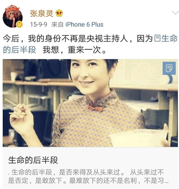 她在微博上写道:今后我的身份将不再是主持人,因为我的生命后半段想重来一次。