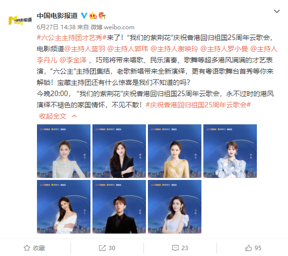 在庆祝香港回归祖国25周年云歌会中,中国电影频道推出了“六公主主持团才艺秀”,除了会主持之外,电视节目主持人往往还是一位多面手,他们的才艺也是不输一线艺人,此次CCTV-6的主持人也是首次献艺,“将带来唱歌、民乐演奏、歌舞等超多港风满满的才艺表演,更有粤语歌舞台首秀”。