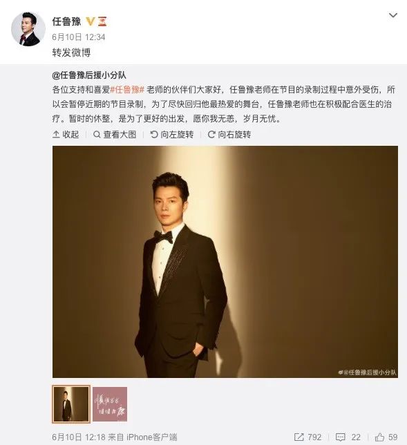 6月10日午间,@任鲁豫后援小分队 微博发布消息:各位支持和喜爱任鲁豫老师的伙伴们大家好,任鲁豫老师在节目的录制过程中意外受伤,所以会暂停近期的节目录制,为了尽快回归他最热爱的舞台,任鲁豫老师也在积极配合医生的治疗。暂时的休整,是为了更好的出发,愿你我无恙,岁月无忧。随后任鲁豫也转发了这条微博。