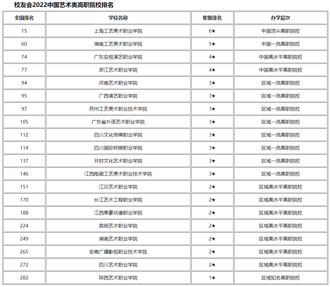 校友会2022中国艺术类高职院校排名