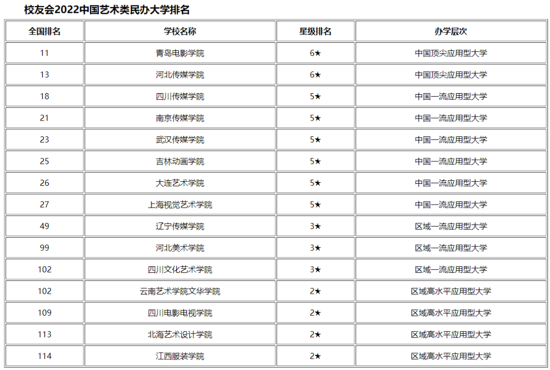 校友会2022中国艺术类民办大学排名