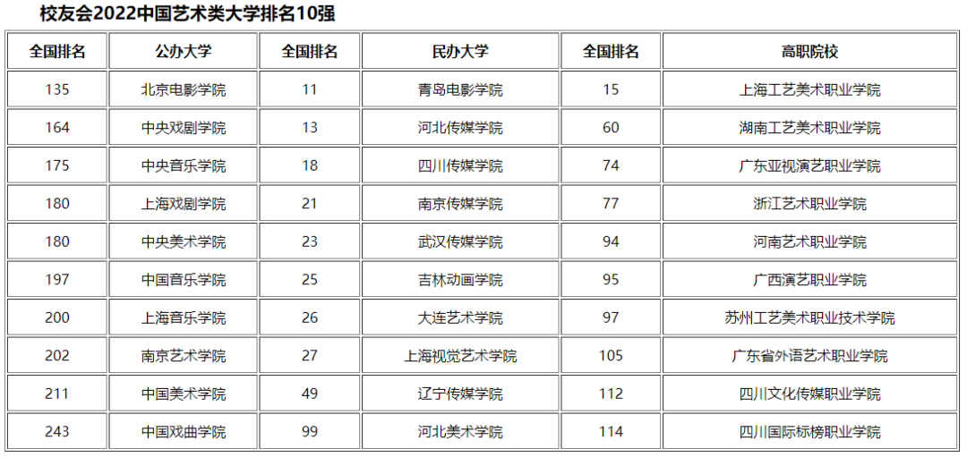 校友会2022中国艺术类大学排名10强