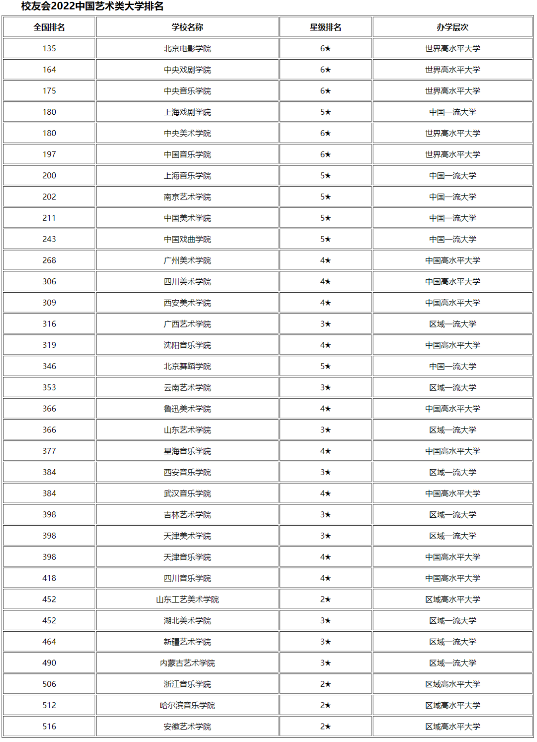 校友会2022中国艺术类大学排名