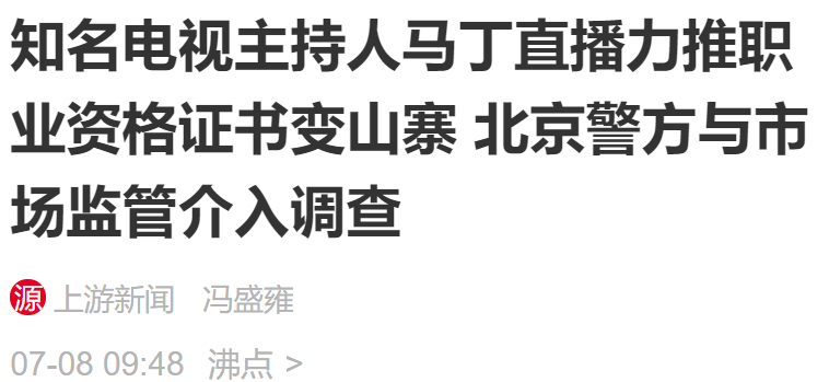 7月8日,上游新闻发布了《知名电视主持人马丁直播力推职业资格证书变山寨 北京警方与市场监管介入调查》的文章,文中提到来自北京的小莉(化名)一直想利用闲暇时间做点兼职。2022年2月,她在网上看到知名电视节目主持人马丁在直播间介绍一门名为“婚姻情感咨询师”培训的课,培训机构老师介绍,马丁亲自教学,由中国国家人事人才培训网(以下简称:国培网)发证,是就业的重要凭证,5180元的课程学完保证可拿国家认可的准入类资格证书。但事后小莉等学员才发现,这只是一个企业培训合格证书,证书落款日期居然还在报名前!