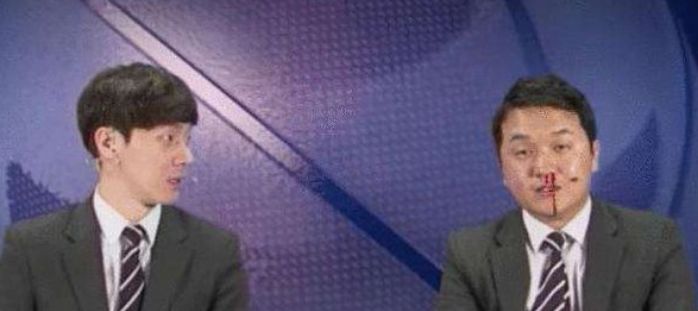 但是正说着说着其中一名男主持突然狂流鼻血,这时候他的搭档转过脸与他对话,不料看到对方的脸上都是血吓了一大跳,但是并没有因此惊慌失措,只是点头向对方示意了一下。