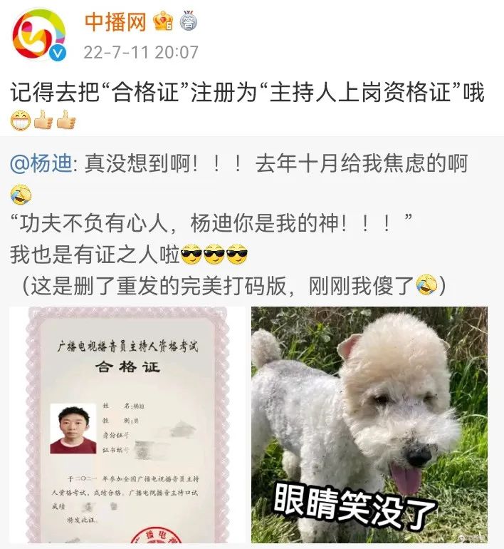 2022年7月11日15点31分著名综艺主持人杨迪在微博上晒出自己成功考取国家广播电视播音员主持人资格考试的合格证书,随后话题#杨迪拿到主持人合格证#迅速登上了微博热搜榜前列。