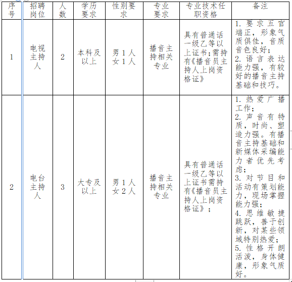(三)个人资料包括报名表,本人身份证,毕业证书及教育部学历证书电子注册备案表、普通话等级证书、上岗资格证以及相关工作经历和其他能体现本人业务成果、业务水平的证明材料,二寸免冠近照。电视主持人岗位还需提供主持视频样片一份,时长5分钟,突出本人主持镜头,减少节目素材内容,格式为主流视频格式;电台主持人岗位还需提供时长各2分钟的新闻播报音频和类型不限的节目音频,格式为mp3文件。复试入围者请携带相关原件到场复核。