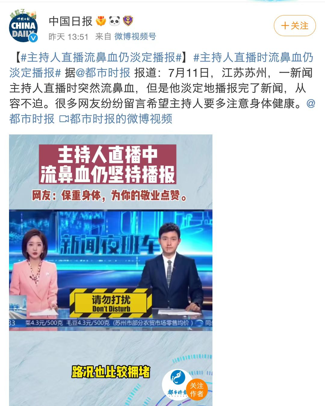 在7月11日晚上,江苏苏州,一位新闻主持人直播时突然流出了鼻血。