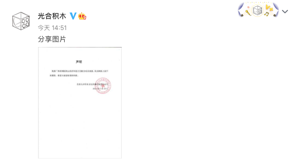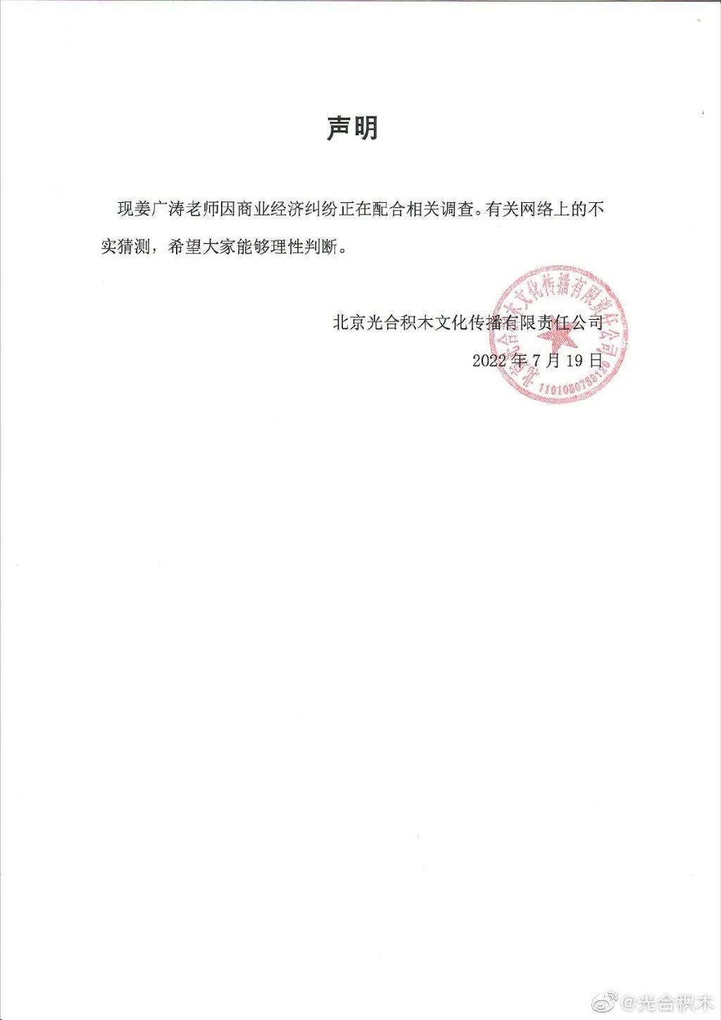 7月19日下午,北京光合积木文化传播有限责任公司通过官方微博发布声明,称姜广涛因商业经济纠纷正在配合相关调查。