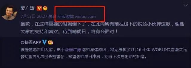 巧的是,在本月13日动漫嘉年华通知姜广涛因个人身体原因无法出席签售活动,向大家抱歉。对于这个消息,有网友称就是事发的委婉说法,因为从这以后他就取消了线下所有活动,社交平台后缀也发生了变化,怀疑后续的宣传博都是工作人员在运营。