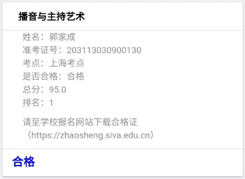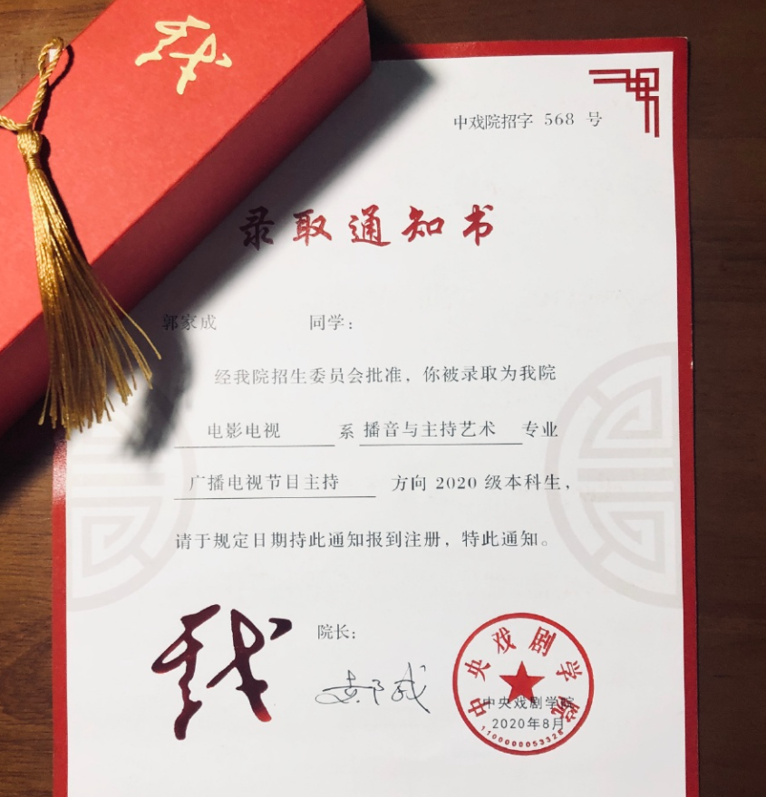 浙江传媒学院播音专业全国六十名,中央戏剧学院播音专业全国三十三名,黑龙江男生唯一。