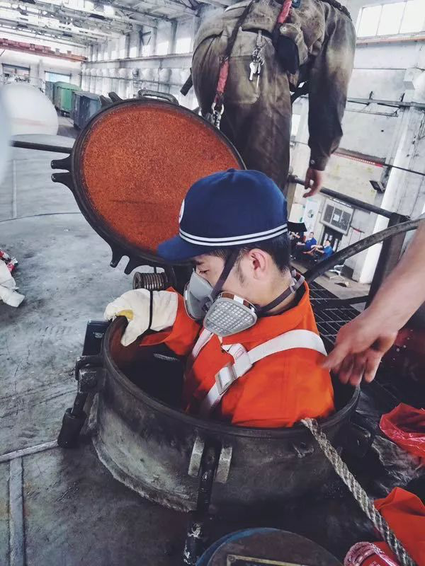 当时整个工厂内的温度达到了48度左右,而罐内有60多度,但是他要穿着几十斤重的防护服,还有防毒面罩,密不透风,然后下到这个罐内作业,每次大概只能作业几分钟,就要上罐来透气一次,因为里面根本没有办法呼吸。