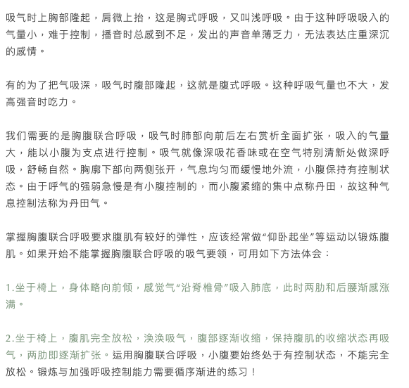 为了达到这些要求,必须掌握胸腹联合呼吸,也就是我国传统的说唱中讲究的丹田气。这种呼吸方式最科学,最自然。有利于健康,呼吸训练的重点是呼气!